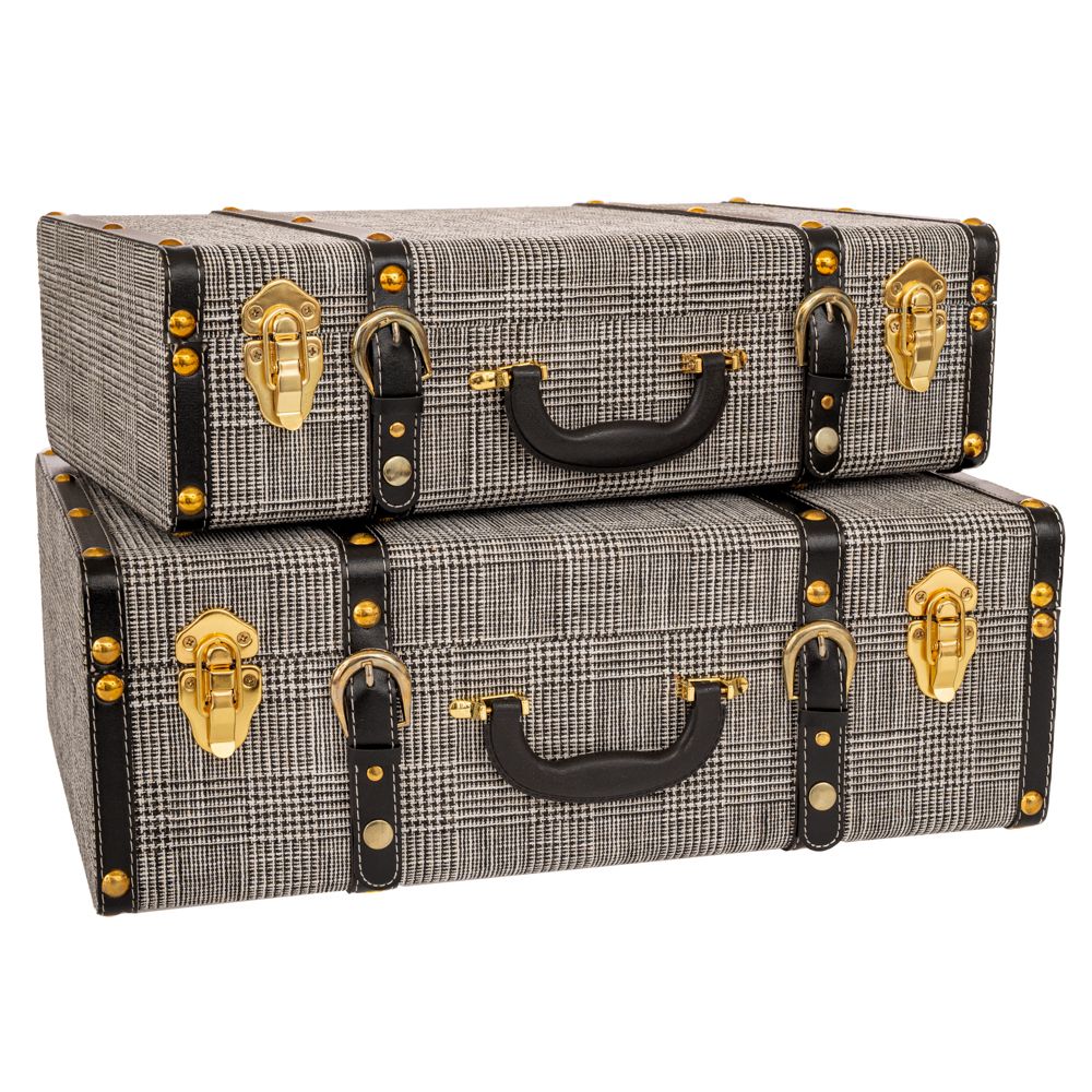 Διακοσμητικές βαλίτσες σετ των 2 τεμαχίων. Είναι επενδυμένες με ασπρόμαυρο καρό ύφασμα και διακοσμημένες με μαύρες δερμάτινες λεπτομέρειες καθώς και χρυσά μεταλλικά κλειδώματα που προσθέτουν στυλ και κομψότητα.