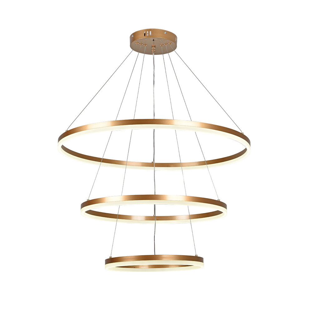 Κρεμαστό φωτιστικό LED 100W σε χρυσαφί απόχρωση με επιλογή απόχρωσης φωτισμού απο διακόπτη που βρίσκεται στην β΄άση του φωτιστικού (3CCT by switch on base) .Το προϊόν παρέχεται με 2 επιλογές τοποθέτησης .Το προϊόν ντιμάρεται απο απλό διακόπτη τοίχου με εναλλαγή στο πάτημα (3 step dimmable)