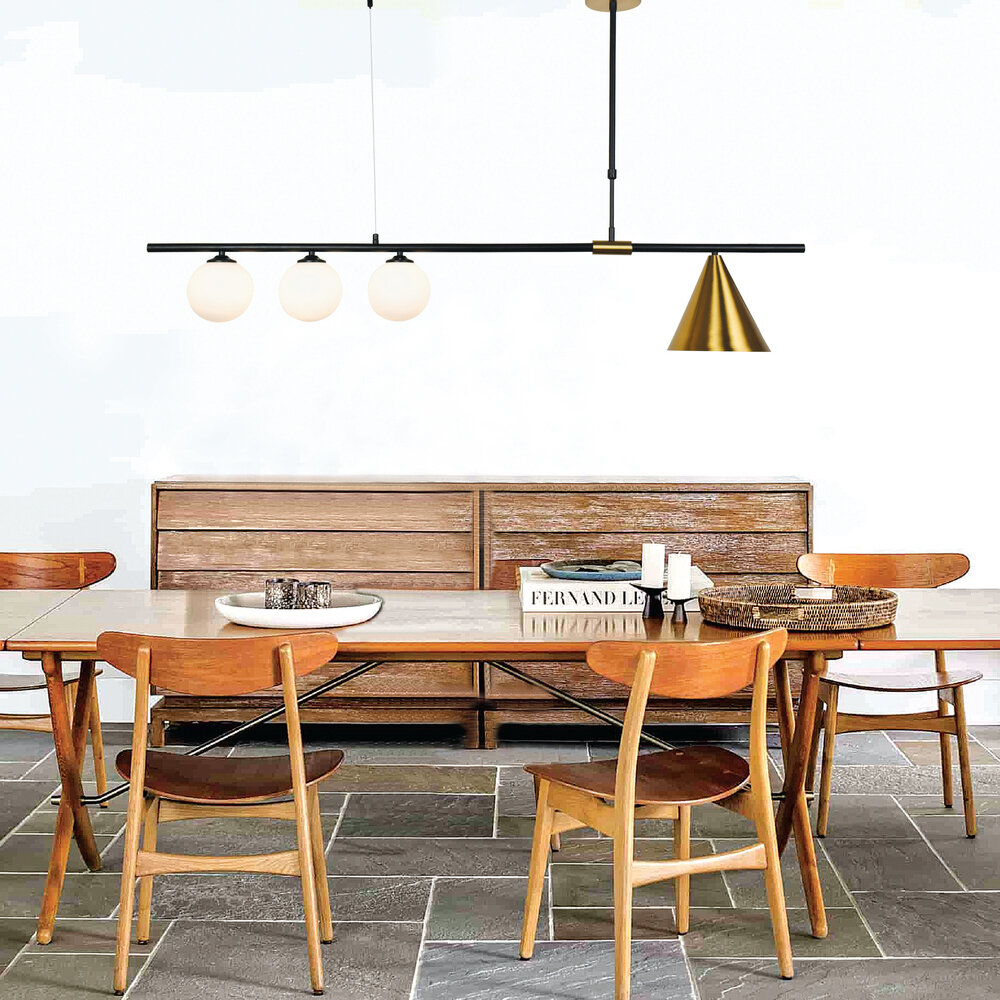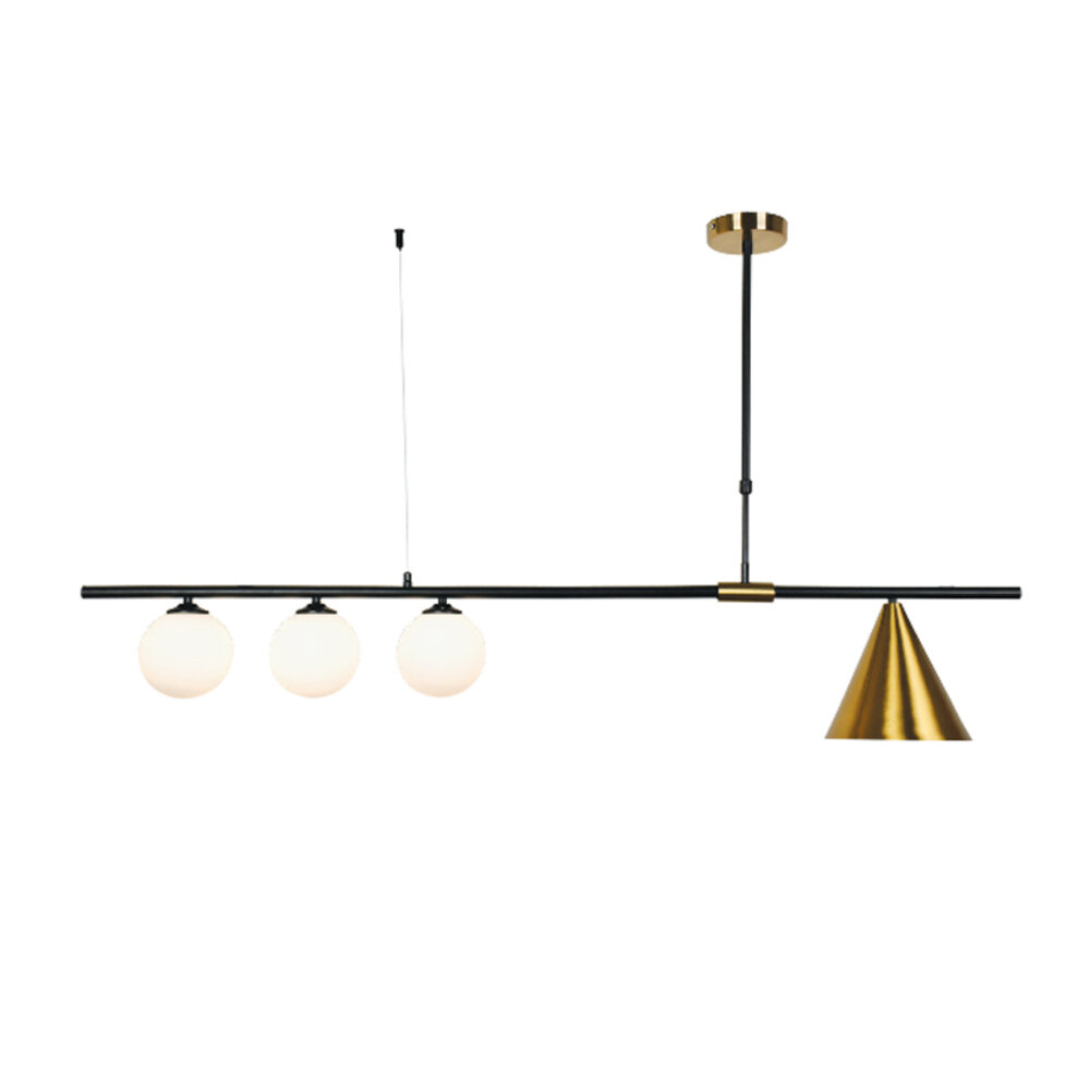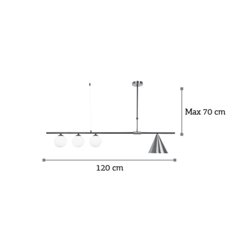 Πρόκειται για ένα κρεμαστό μεταλλικό φωτιστικό μαύρου χρώματος με χρυσαφί λεπτομέρειες. Ο φωτισμός του είναι συνδυαστικός, αποτελούμενος από τρεις λαμπτήρες διάχυσης καλυπτόμενους από λευκή οπαλίνα και έναν λαμπτήρα καλυπτόμενο από μεταλλικό καπάκι. Η ανάρτηση είναι ρυθμιζόμενη ώστε να προσαρμοστεί στον χώρο τοποθέτησής του.